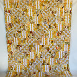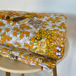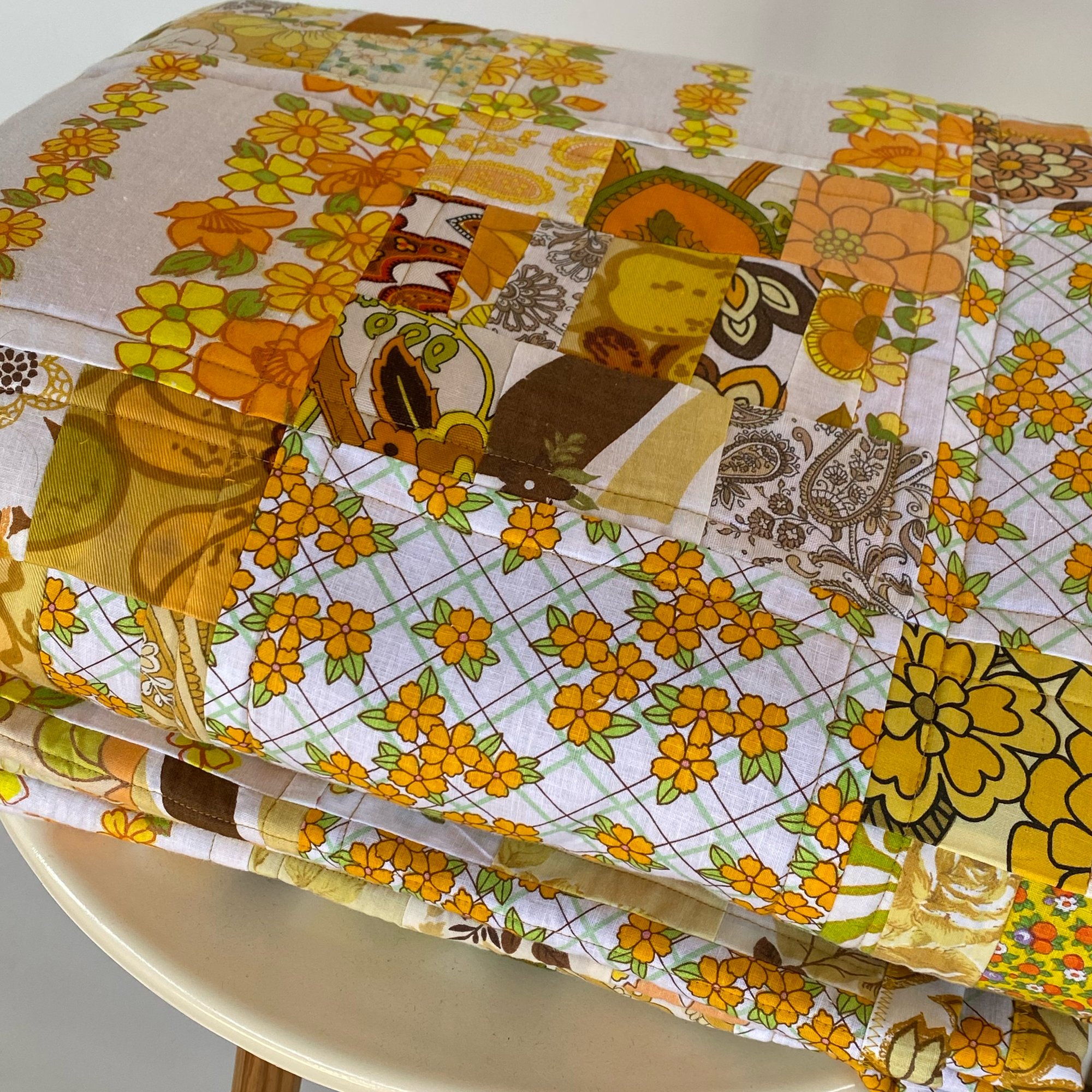 Amber Stitches showcase a stunning handcrafted patchwork of vibrant upcycled fabrics, each piece carefully selected for its unique pattern and vintage charm. The intricate stitching reflects meticulous artisanship, blending traditional techniques with a modern aesthetic. A cozy wool blanket backing adds warmth and durability, making this quilt a timeless heirloom perfect for draping over a bed or cozying up on a chilly evening.